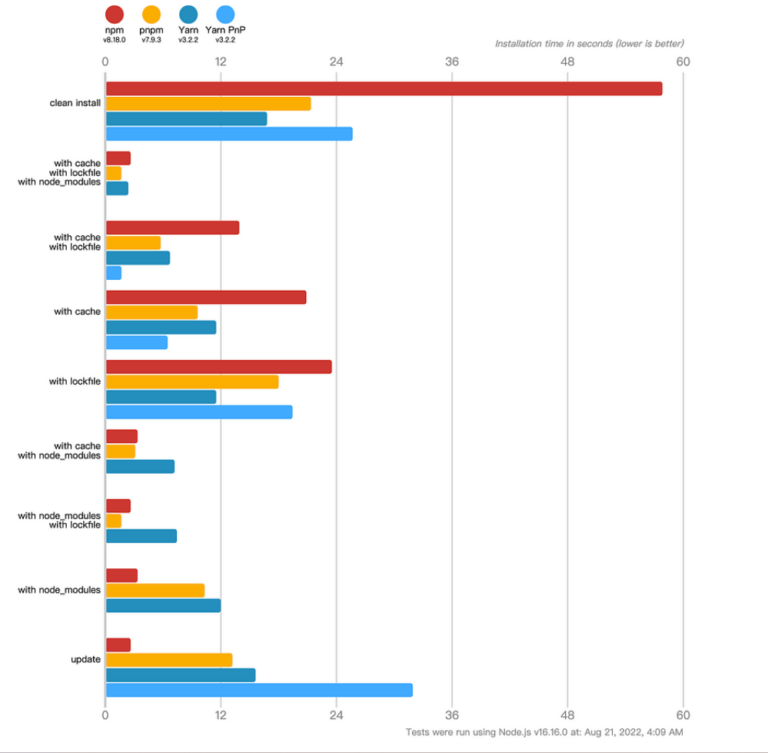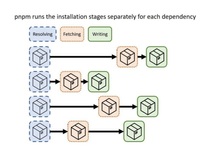 PNPM is faster than other dependency managers because its installation has no steps that can’t be done simultaneously. Each dependency has its stage, and the next stage begins as soon as each dependency is installed.